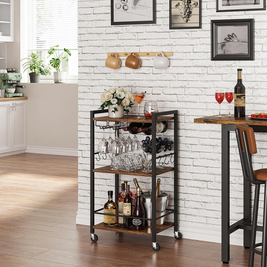TUTOTAK Bar Cart, Home Bar Serving Cart with 3-Tier Shelf, Drink Cart with Wine Rack, Glass Holder, Rolling bar carts for The Home, Living Room, Brown BC01BB035