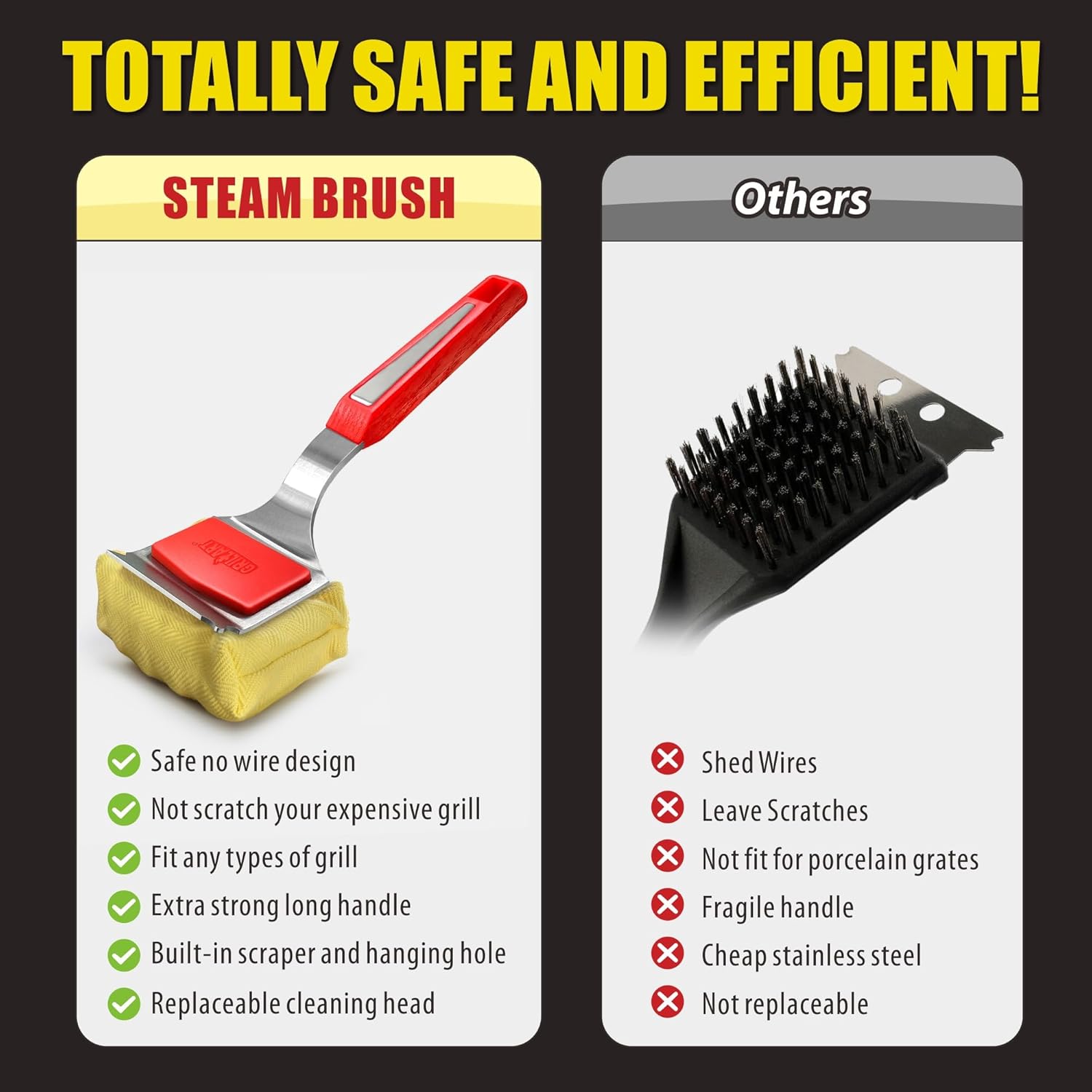 - Safe and Efficient - Steam Wizards cleaning can save a lot of elbow grease when dealing with those stubborn residues. With a safe bristle-free grill brush, you don't have to worry about swallowing those dangerous wire bristles that can break off and end up in your food. It's safe and efficient!