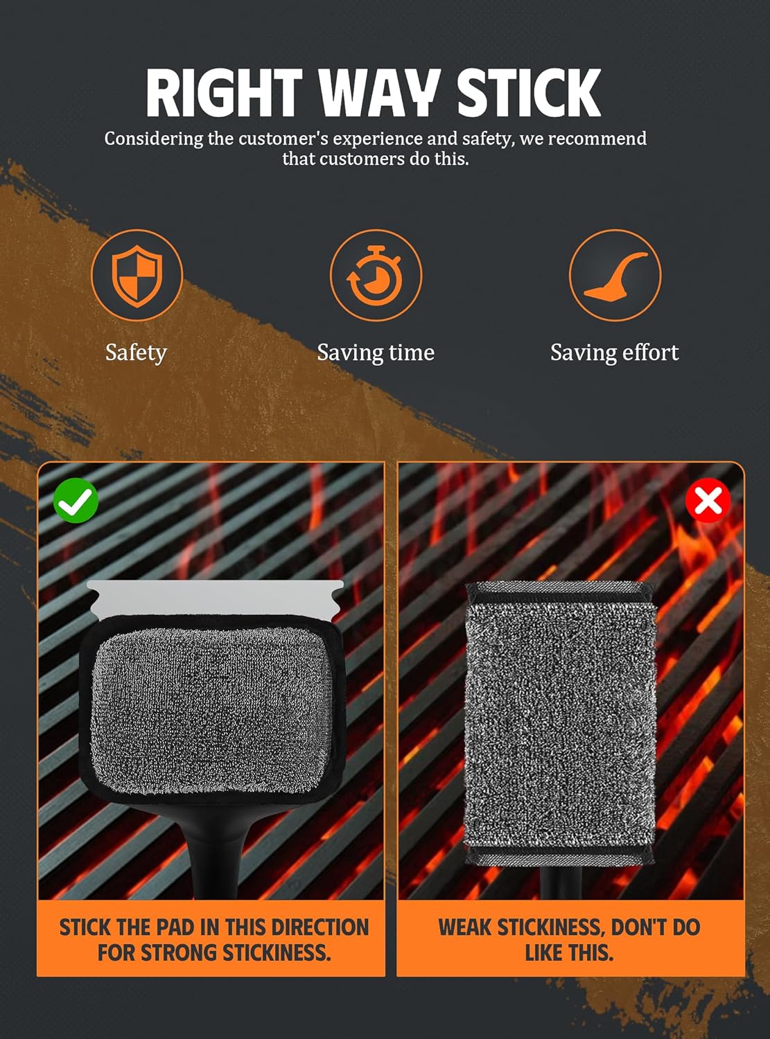 - UPGRADED ADHESION Our improved sticking pad with 8 Screw Locked, ensures the replaceable cleaning pad stays firmly attached to the handle. This bristle-free BBQ brush makes cleaning effortless and efficient, even during long grilling sessions. Tips: If replacement pad is required, wait until the replacement head cools down before pulling it off with force. (PS: The pads of other grill brushes are cloth, not strong sticky)