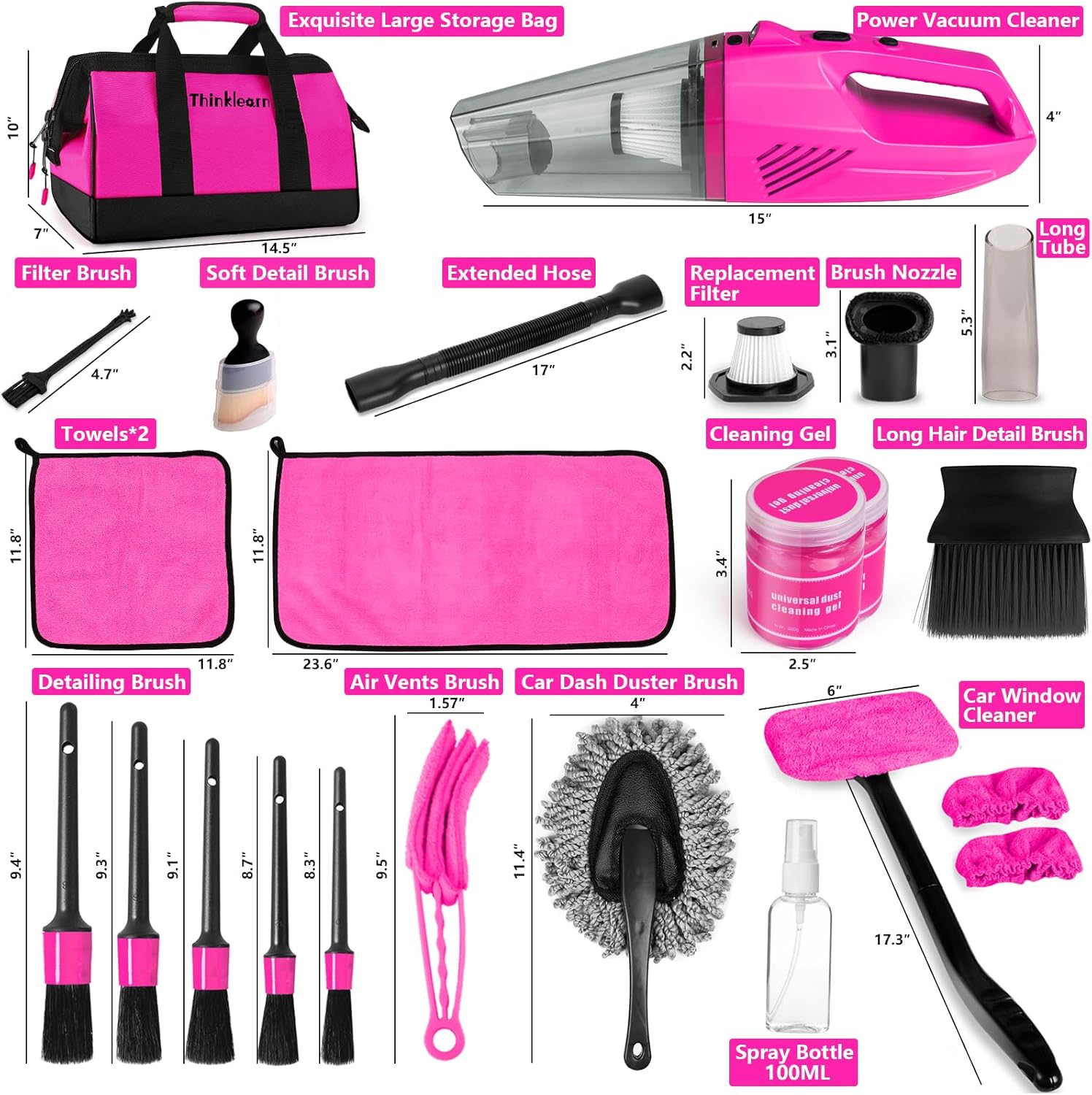 - ThinkLearn Car Cleaning Kit, Car Vacuum Detailing Kit Interior with High Power Handheld Vacuum, Including 7Pcs Detailing Brush Set, Windshield Cleaner, Pink Car Accessories for Women