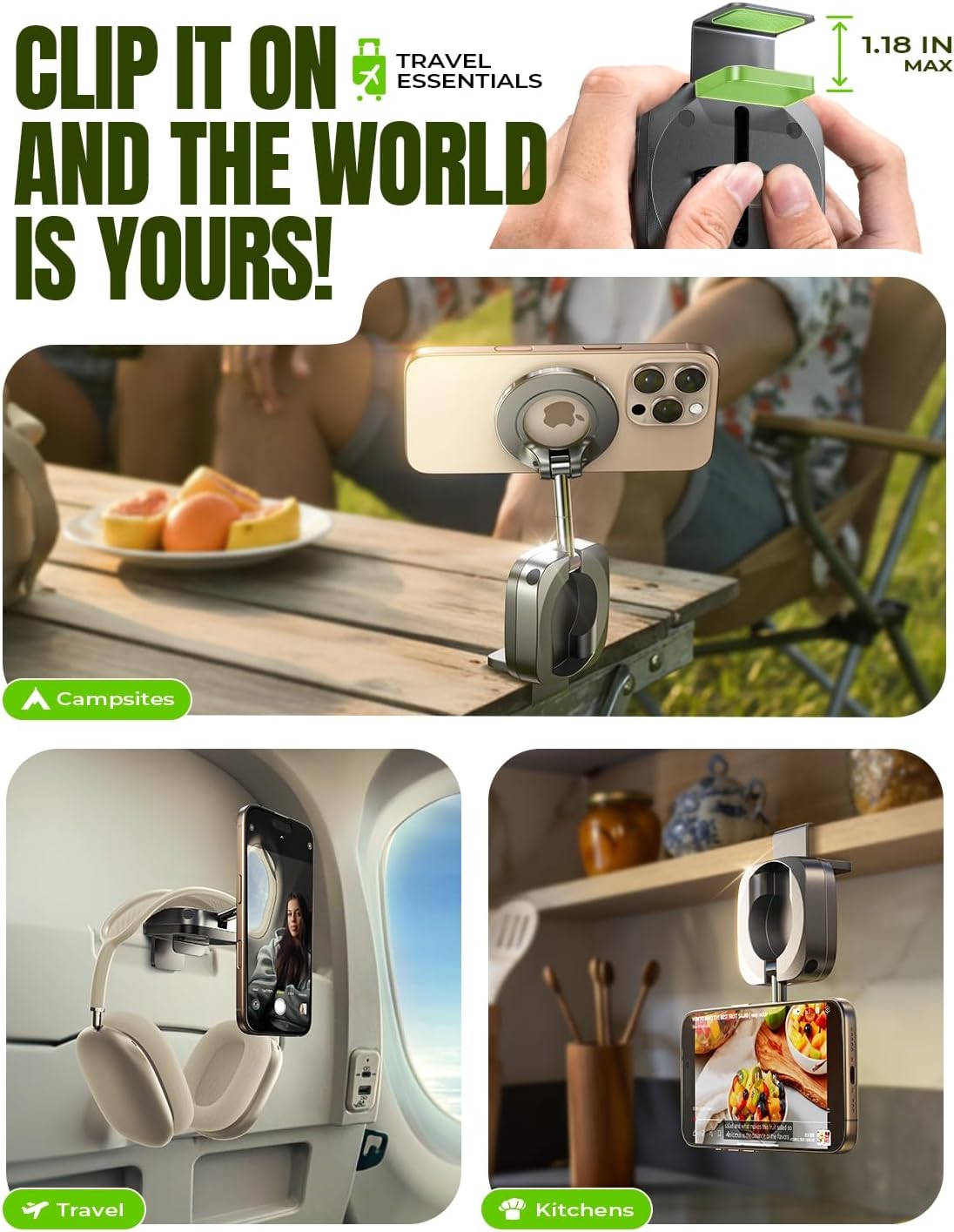 - 2025 Spring Break Essentials:The go-to gift for all travelers – men and women alike – and a New York Times 2025 “Top Tech Gifts” finalist. Lisen phone holder securely onto luggage handles, tray tables, desks, chairs, shelves, beds, books, or power banks, Can double as a compact selfie stick for recording vlog videos – Warm-Weather Must-Have for beach vacations and camping essentials