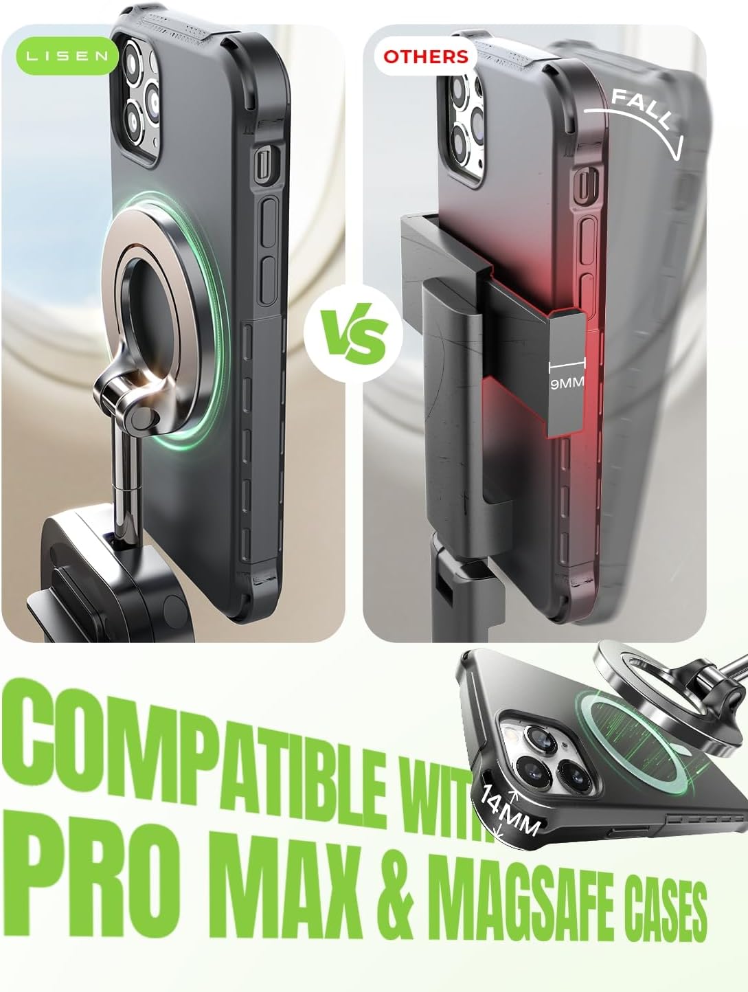 - 360° Flexible for MagSafe Travel Stand:The LISEN for MagSafe Airplane Phone Holder Mount locks your phone in 0.1 seconds, offering 360° rotation for perfect viewing angles. A TikTok Trend Items TOP10, loved by creators for video recording.