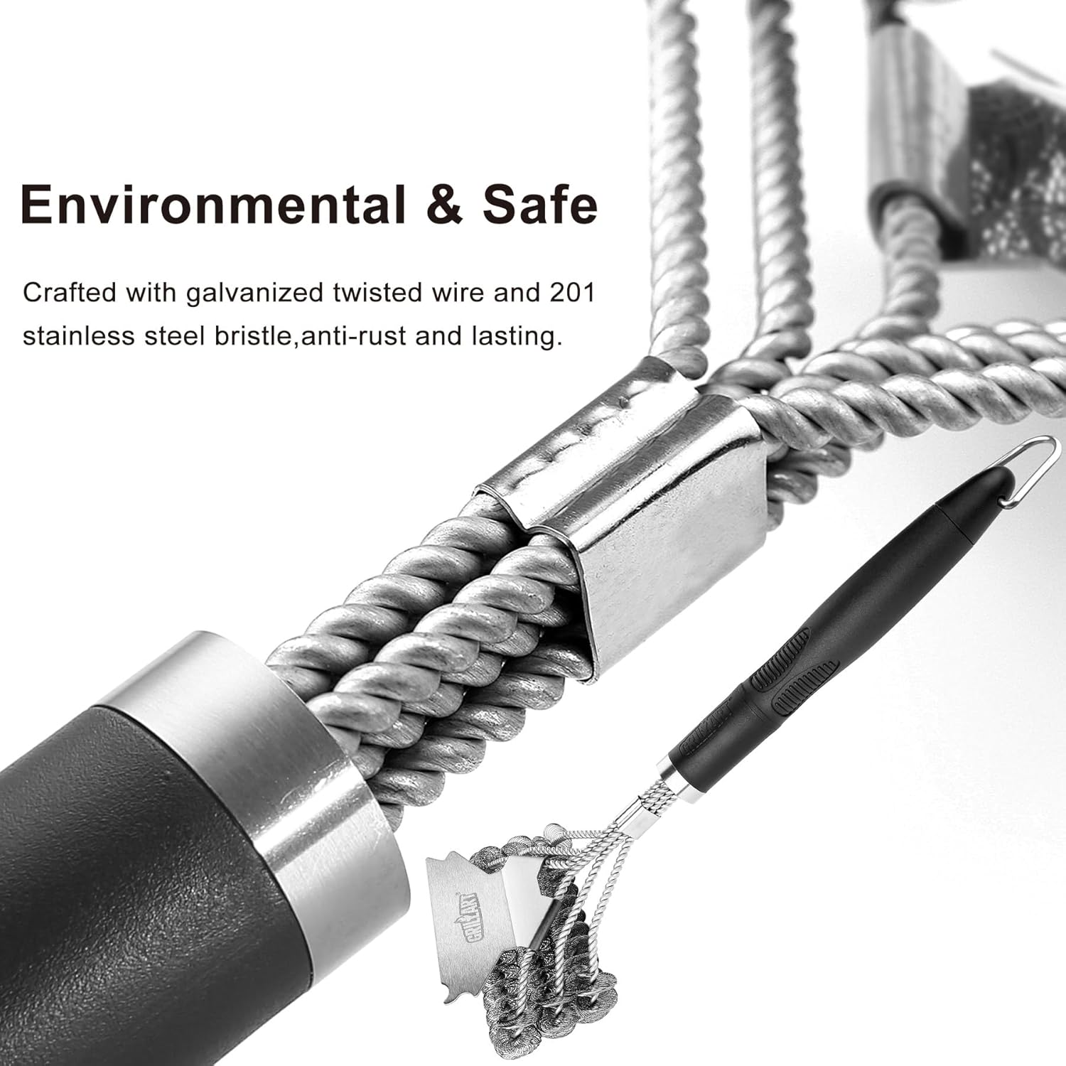 - The Safest Bristle Free Grill Cleaner No wire bristles at all, no melting like nylon grill brushes; With this safe grill brush and scraper, your food will stay 100% Bristle Free. No more worry about swallowing some metal pieces, Let's free to gobble up some favorite barbecue! Save your effort and time, let’s just have fun! (PATENTED design)