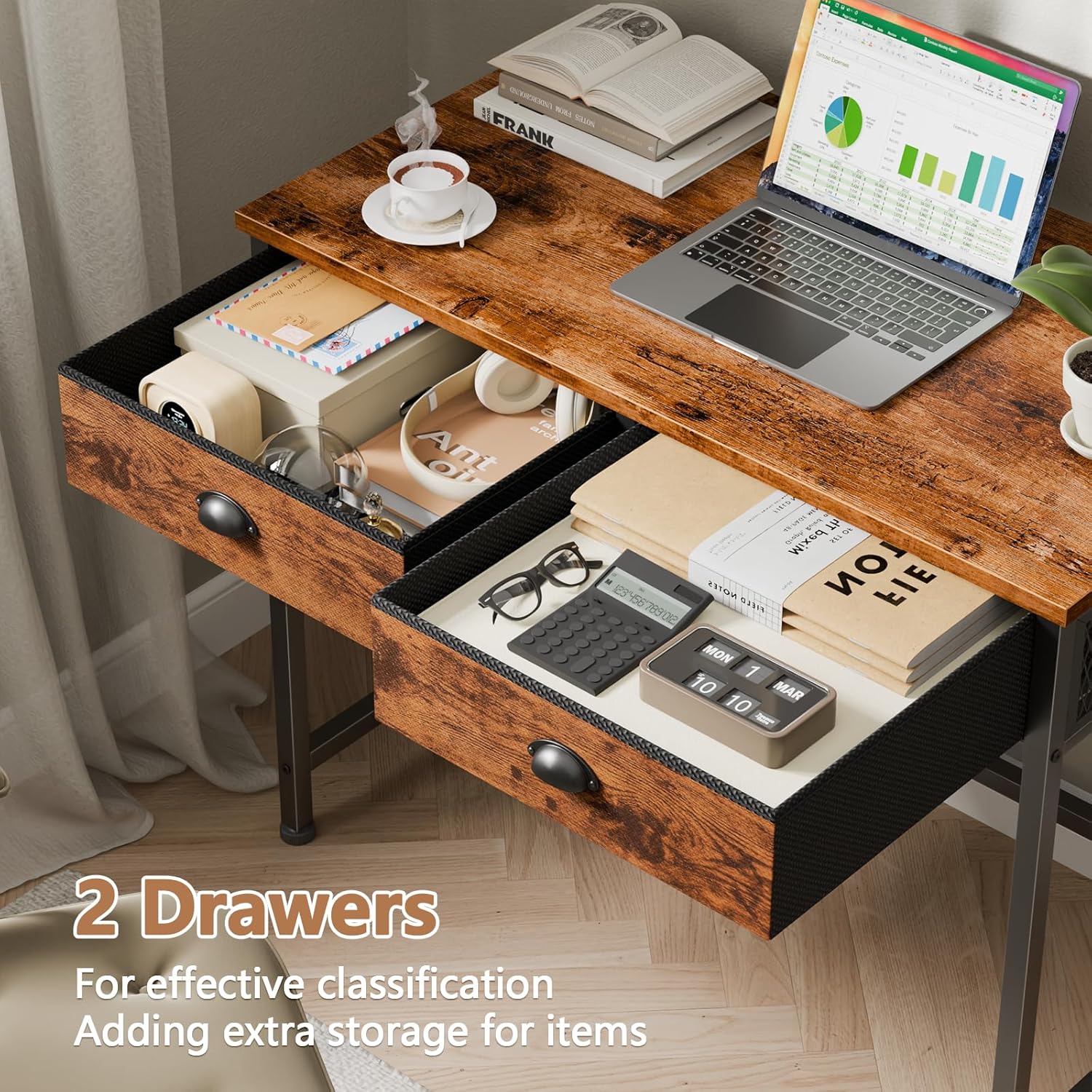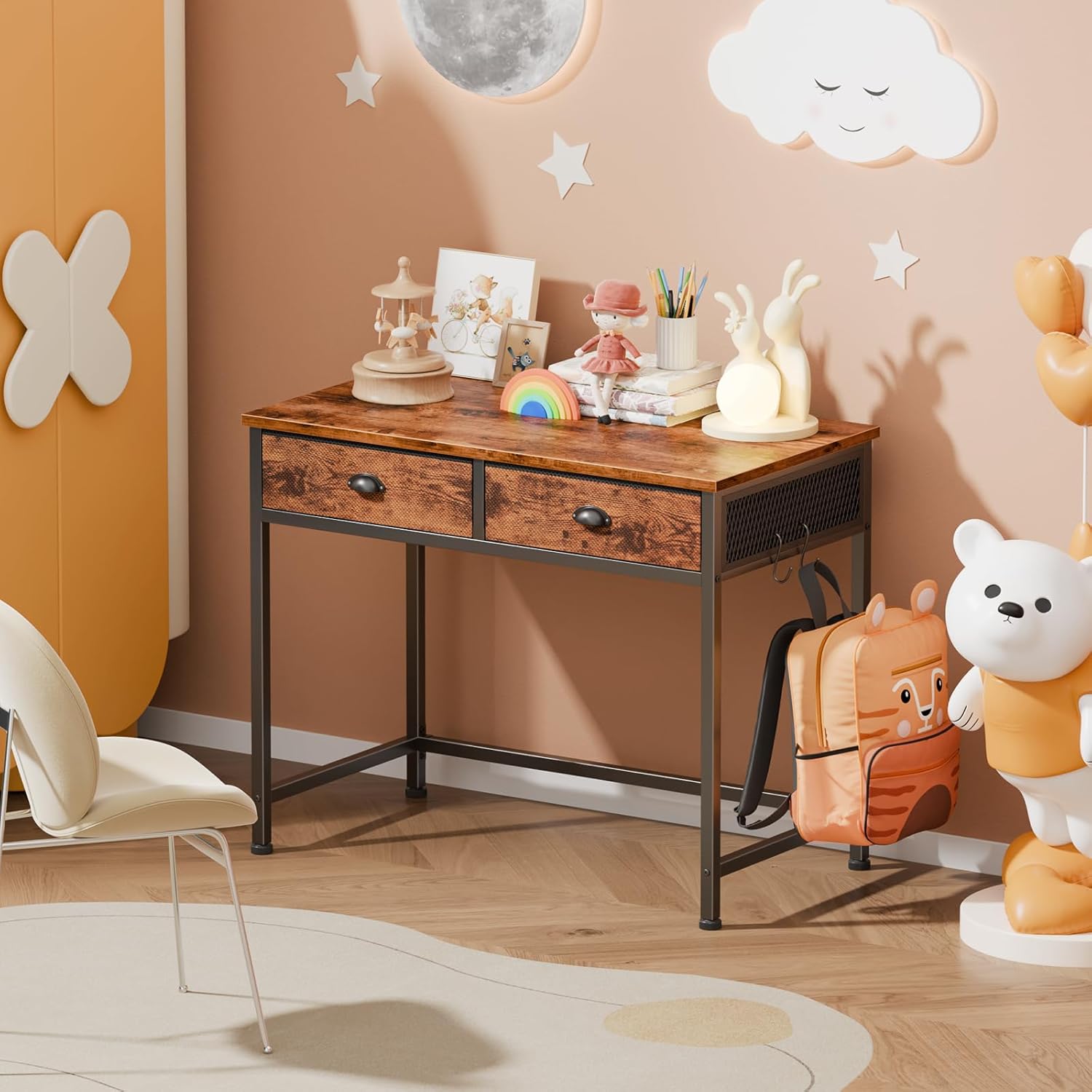 - Furologee Small Computer Desk with 2 Fabric Drawers for Bedroom,34 Inch Home Office Writing Desk, Vanity Desk with Hooks, Simple Study Desk for Small Spaces, Makeup Dressing Table, Rustic Brown
