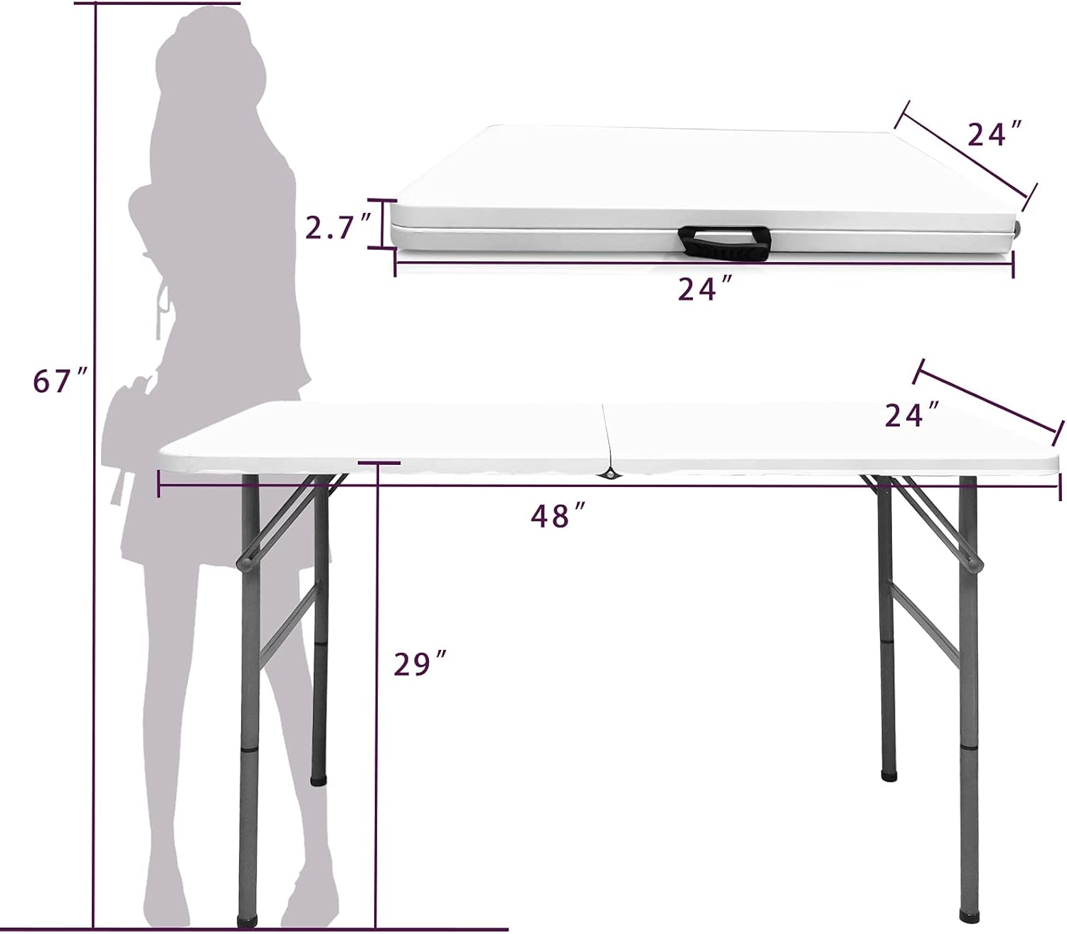 - No assemble needed, can be open and folded in a few seconds. Dimensions: 48"(L) x 24"(W) x 29"(H);