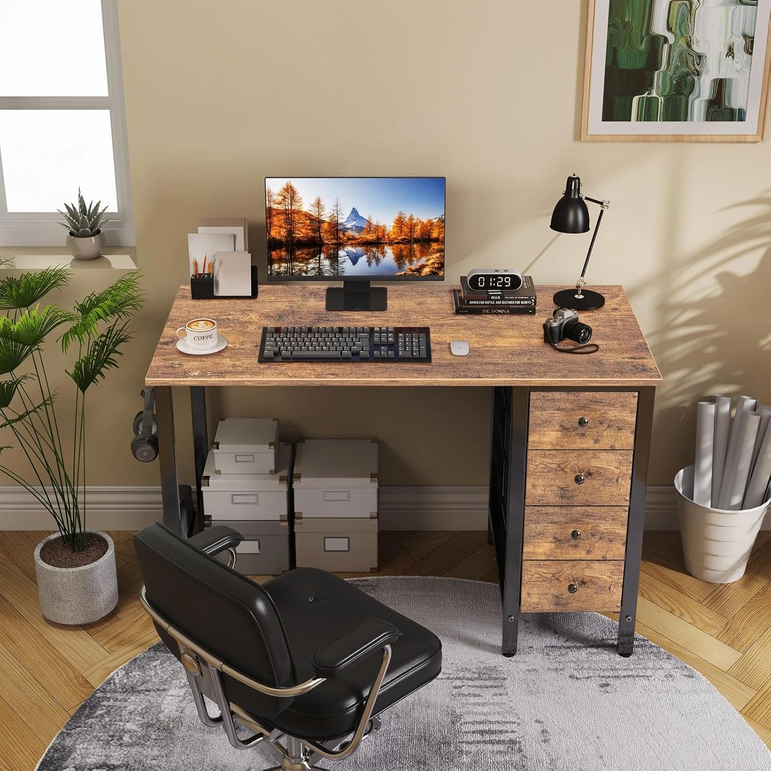 - Vintage Style Design: Computer desk with 4 𝙁𝙖𝙗𝙧𝙞𝙘 𝘿𝙧𝙖𝙬𝙚𝙧𝙨, you can try these two installation methods (left or right). This desk is made of thick P2 particle wood board with scratch-resistant, anti-collision and waterproof, protect home office desk surface from daily wear and tear, rustic brown desktop match black metal steel frame match most room decoration, cute desk suit small space.