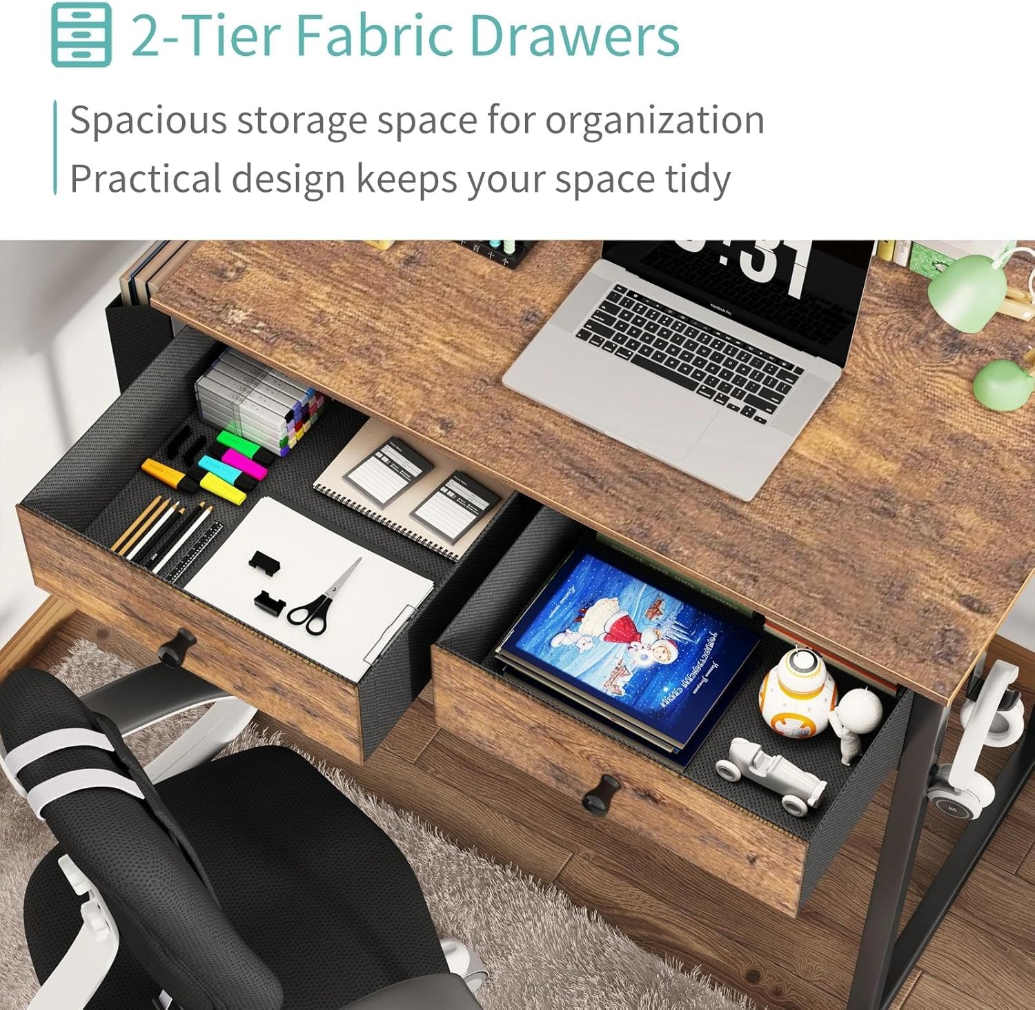 - Vintage Style Design: Computer desk with 2-tier fabric open drawers with wooden front for storage, providing plenty of room for under-desk storage and organization. This desk is made of thick P2 particle wood board with scratch-resistant, anti-collision and waterproof, protect home office desk surface from daily wear and tear.
