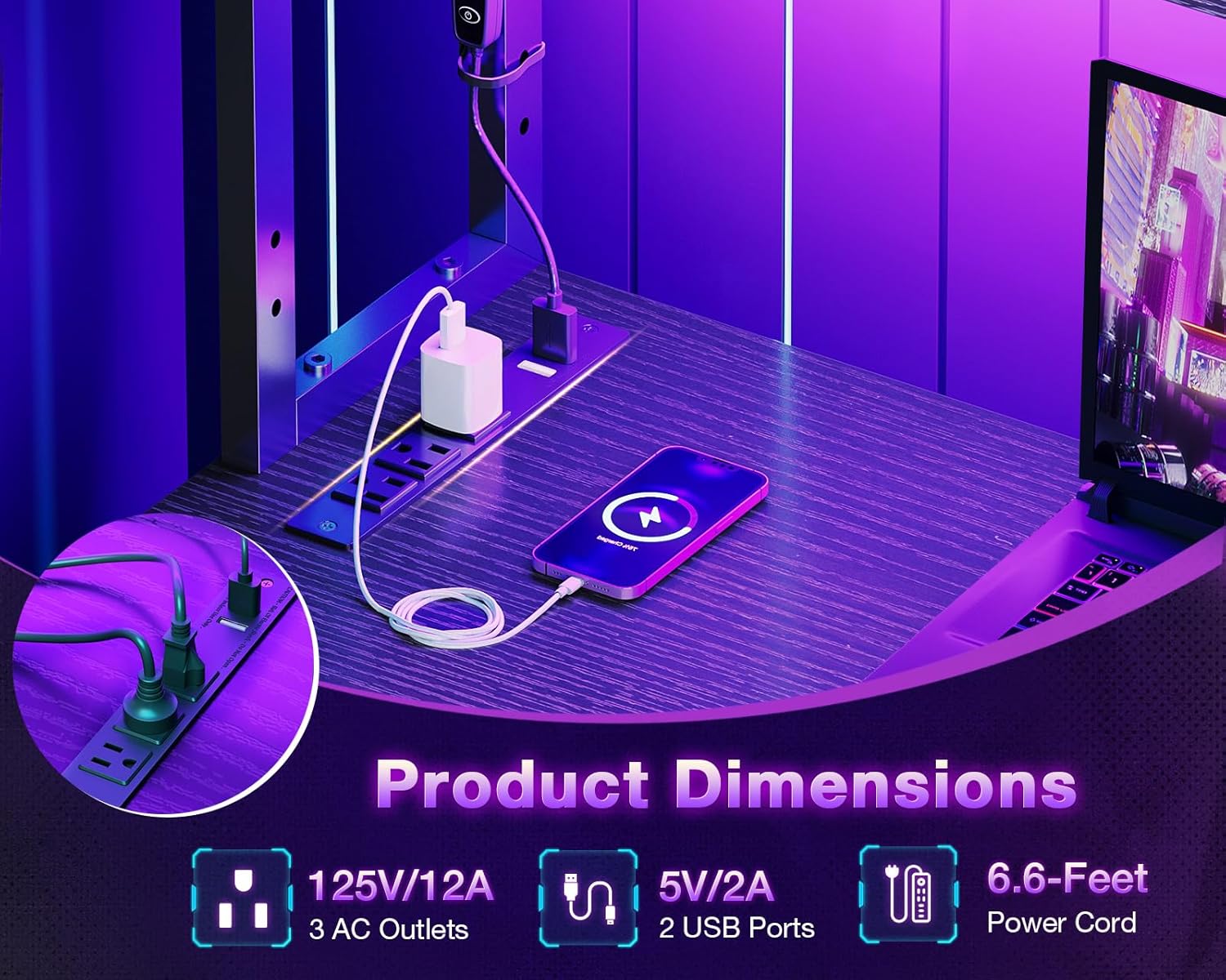 - Built-in USB Charging Ports & Power Outlets Equipped with 3 AC outlets and 2 USB ports, providing centralized power access for desktop equipment and mobile devices. Cable management channels maintain workspace organization during extended gaming sessions or work hours.