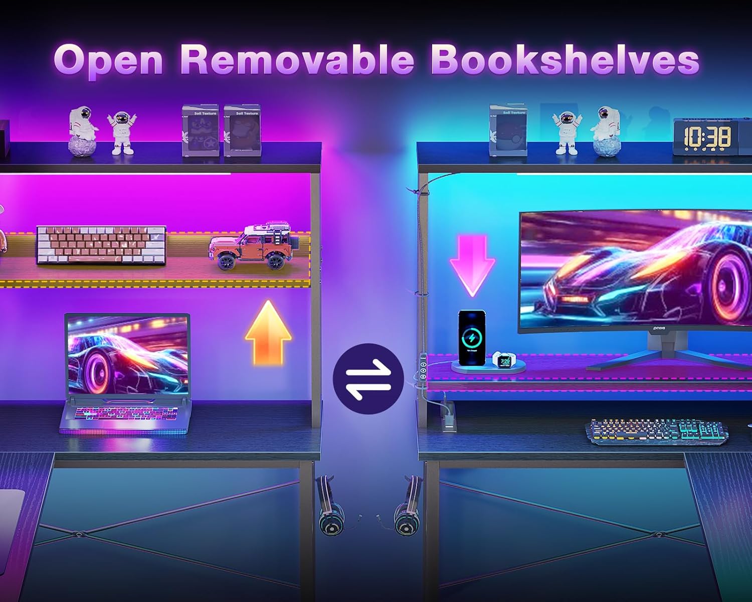 - ODK 53 Inch L Shaped Desk with LED Lighting, Reversible Gaming Desk with Power Outlets, Cornor Computer Table with Storage Shelves & Bag & Iron Hook, Home Office Table for Writing, Study, Black