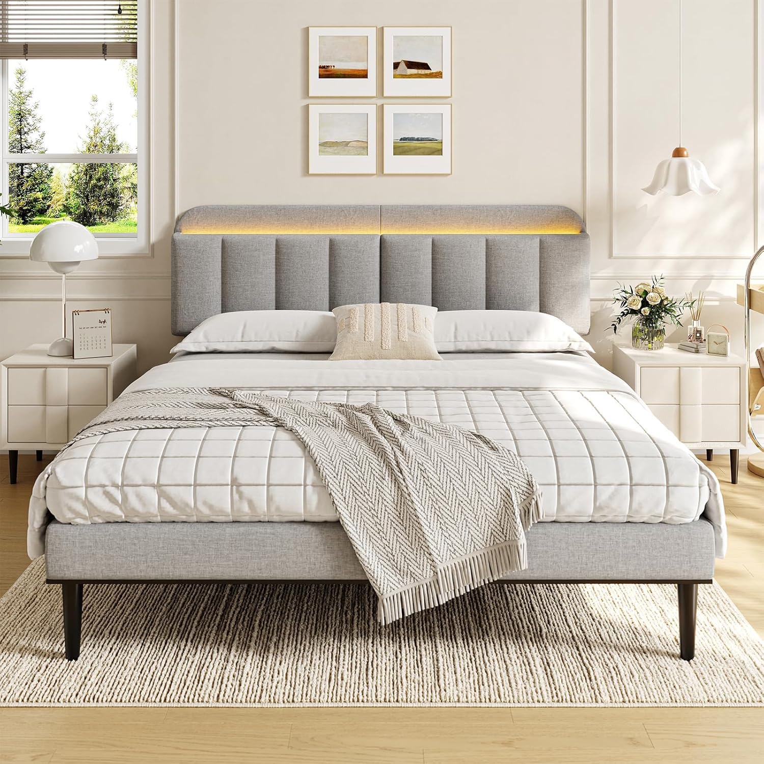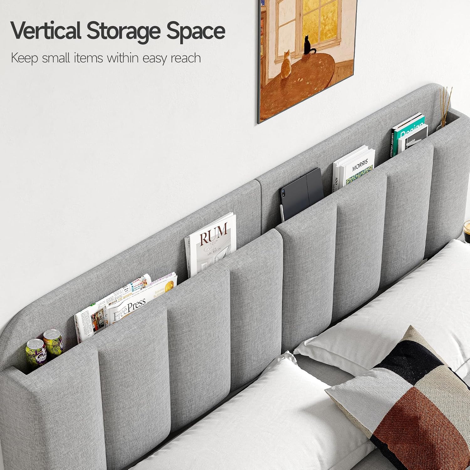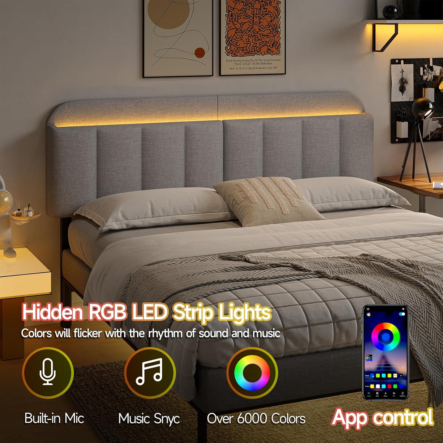 - ONBRILL Adjustable Headboard for King/California King Size Bed Frame, Linen Fabric Bed Headboard with Storage & RGB LED Light in Modern Vertical Channel Design, Light Grey