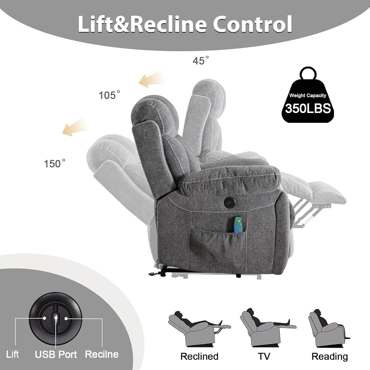 - Power Lift Recliner Chair: Operating this chair is made easy with adjustment functions that work at the push of a button; an easy-to-reach button on the side lets you tilt forward or recline.