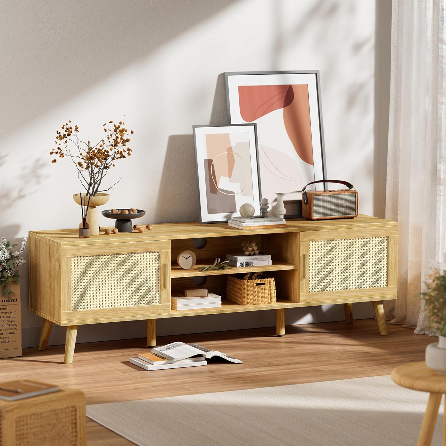- SUPERJARE Boho TV Stand for 65 Inch TV, Entertainment Center with Adjustable Shelf, Rattan TV Console with 2 Cabinets, Media Console, Solid Wood Feet, 4 Cord Holes, for Living Room - Natural, 8782T