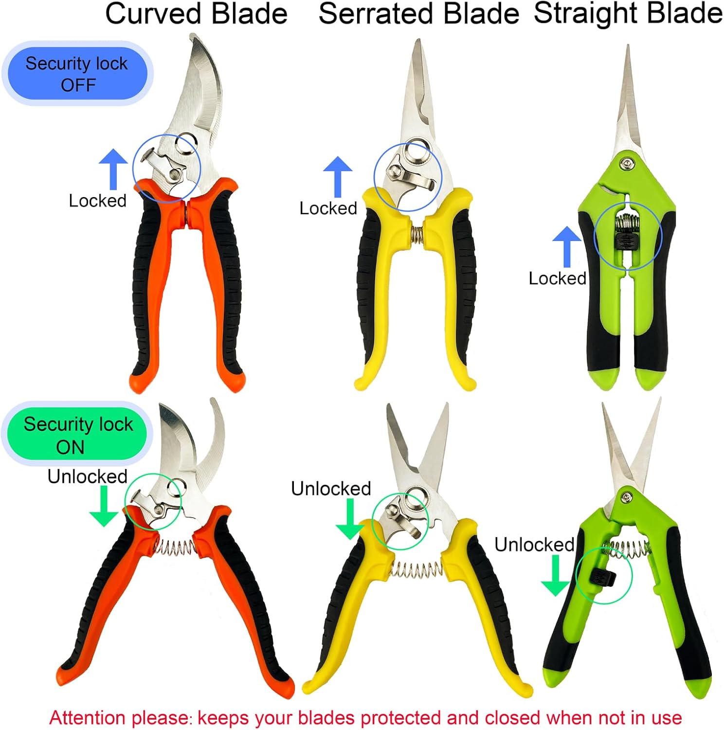 - Secure Easy to Lock: Plant shears have a safety locking mechanism to keep the sharp blades securely closed when not in use and can effectively reduce accidental injuries. Pruning scissors are perfect design