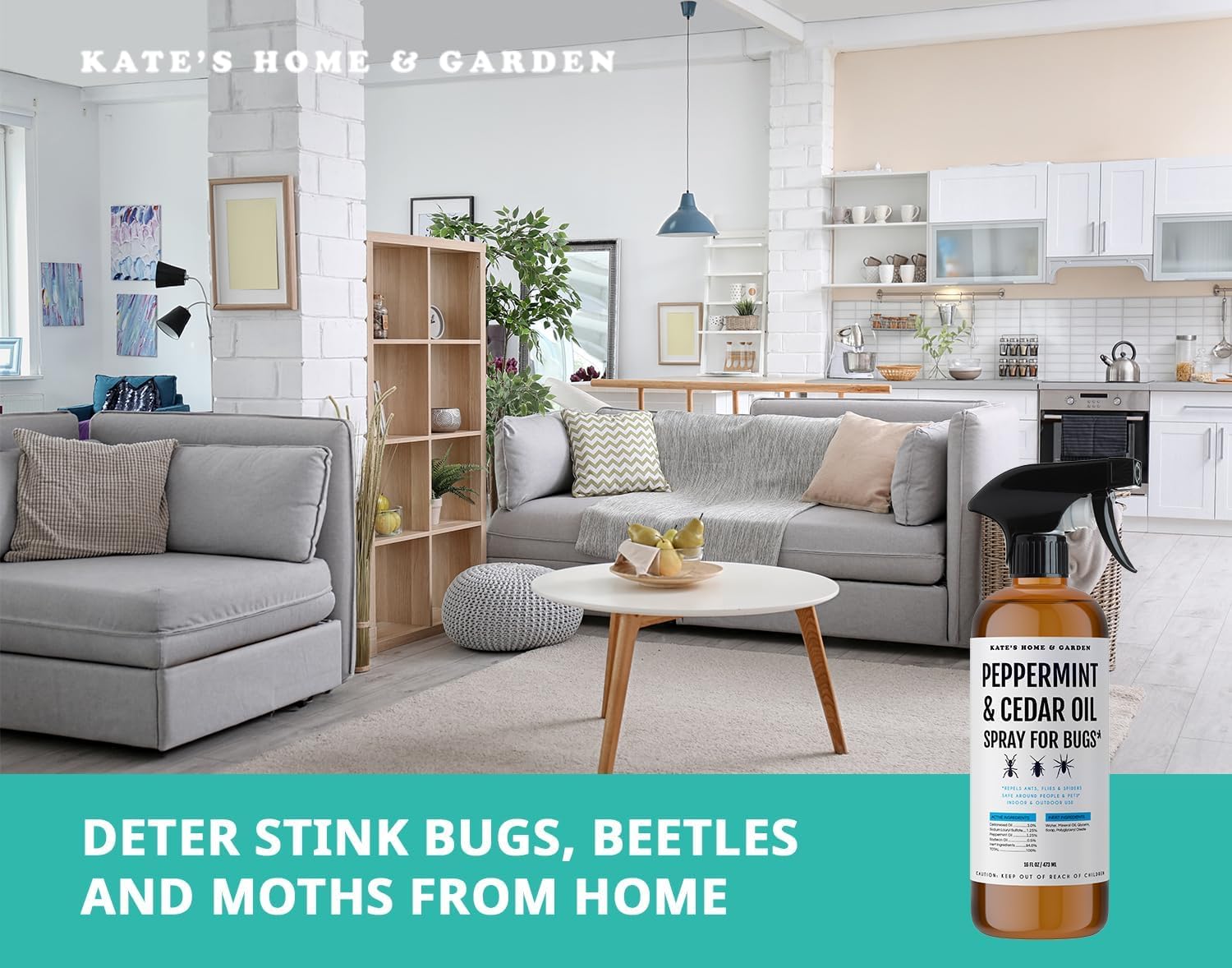 - PEPPERMINT OIL SPRAY FOR BUGS: This natural bug repellent is made with peppermint oil and cedarwood oil for pest control; it works indoor and outdoor by repelling bug, spiders, stink bugs, earwigs, flies, cats and rodents from crawling over all your house, basement, attics, and yard; this is why Kate's Home & Garden insect repellent is a great indoor insect & pest control spray for insects and is a great household supply and camping essential