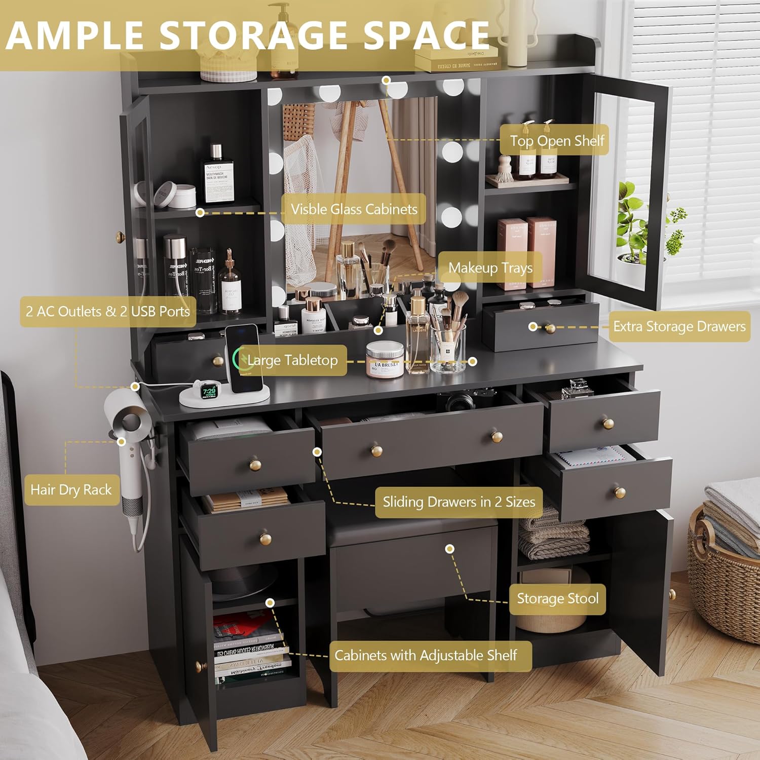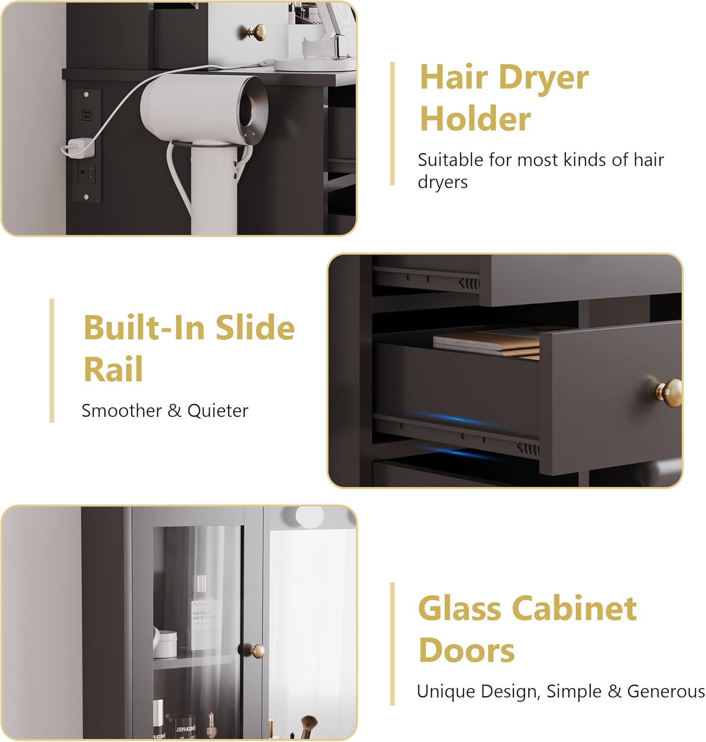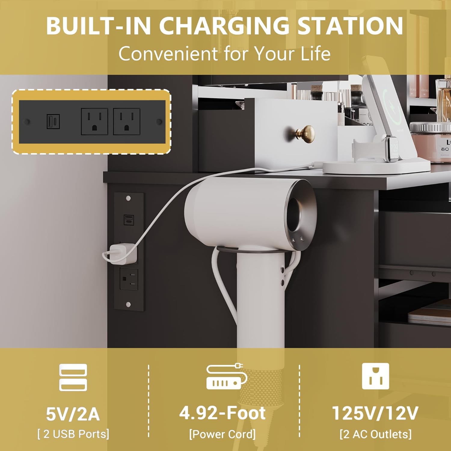 - Built-in Charging Station & Hair Dryer Rack The modern vanity comes with a power strip, including 2 AC outlets and 2 USB ports, through which you can charge and use electronic devices at the same time. In addition, our vanity desk provides you with a hair dryer rack to keep your hair dryer and hair curler within arm’s reach