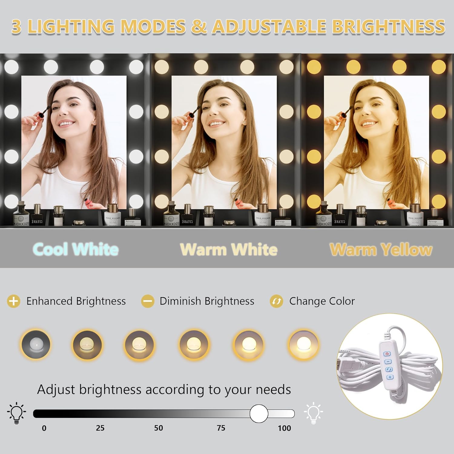 - 3 Lighting Modes & Brightness Adjustable The dressing table is designed with a big mirror. Surrounding the mirror, there are 10 lights. You can change the color in three modes and adjust the brightness of light with the controller