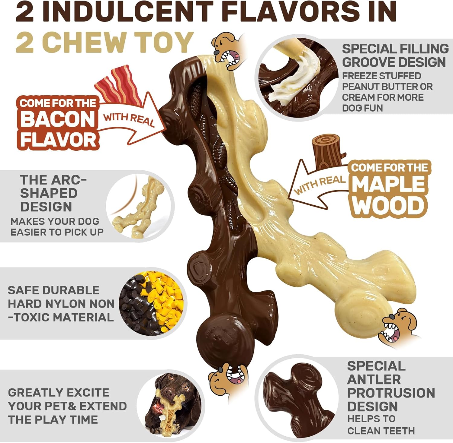 - Truly tempting taste-this dog toy has a unique smoking process, infused with 100% authentic taste; brown toys exude the aroma of crispy bacon, while beige toys have an elegant woody scent. Trust us, these enticing scents will tempt your dog to chew. Charming and chewy, your furry companion will never be able to resist. Not only does it reduce anxiety and prevent destructive chewing, but it also teaches your precious dog healthy chewing habits-perfect for training, teething, weight control and much more