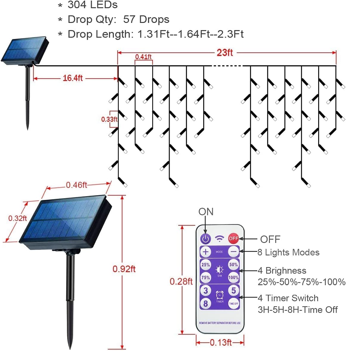- Solar Christmas Icicle Lights: led icicle lights is 40Ft/ 12m long in total, wire with Led: 23Ft/ 7m, lead cord without lights: 16.4Ft/ 5m. The spacing between drops is 4.7 inch/ 12cm, drop lengths 16 inch- 20 inch- 28-inch, number of light bulbs is 4, 5, and 7 respectively.