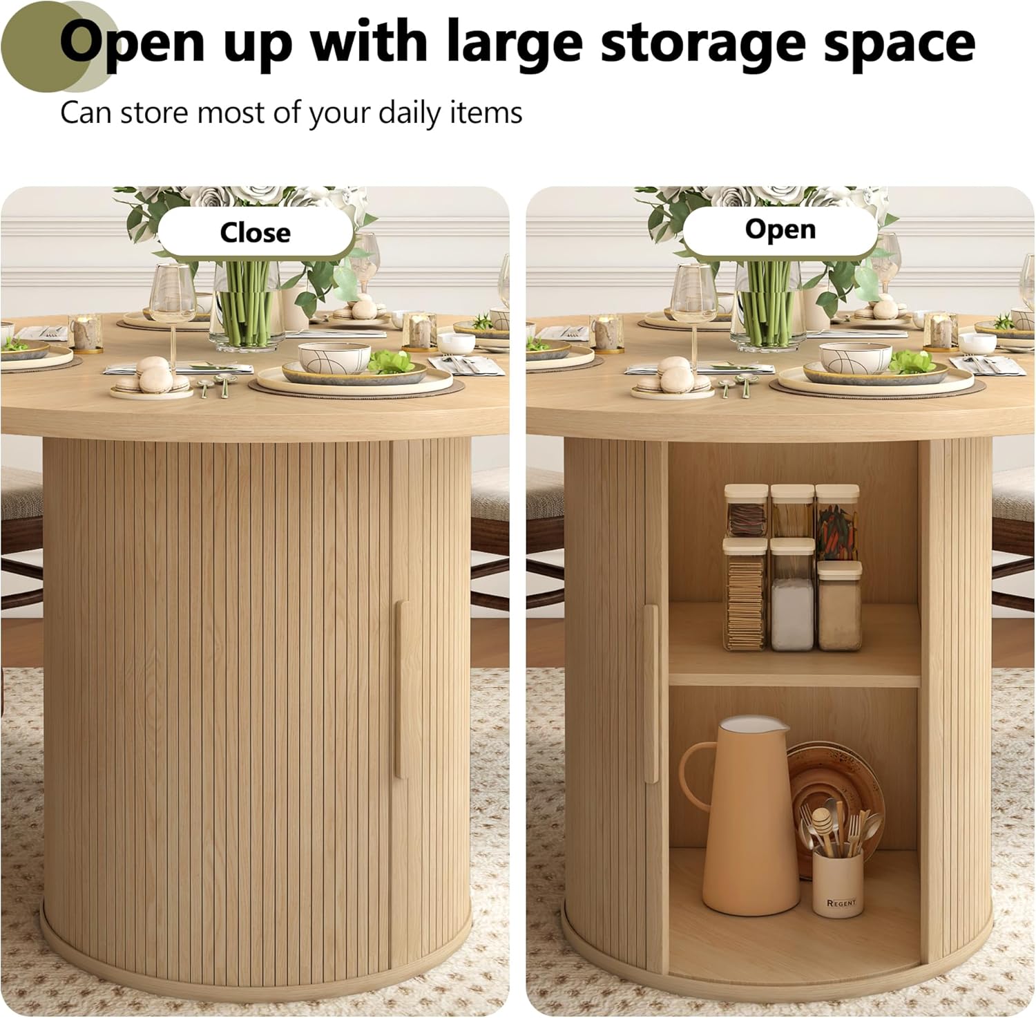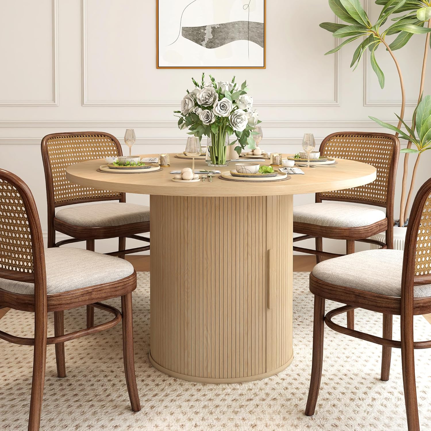 47 inch Round Dining Table for 4, Kitchen Table Dinner Table with 2-Layer Storage Shelf and Wood Slide Door for Home Dining Room Living Room (Natural)