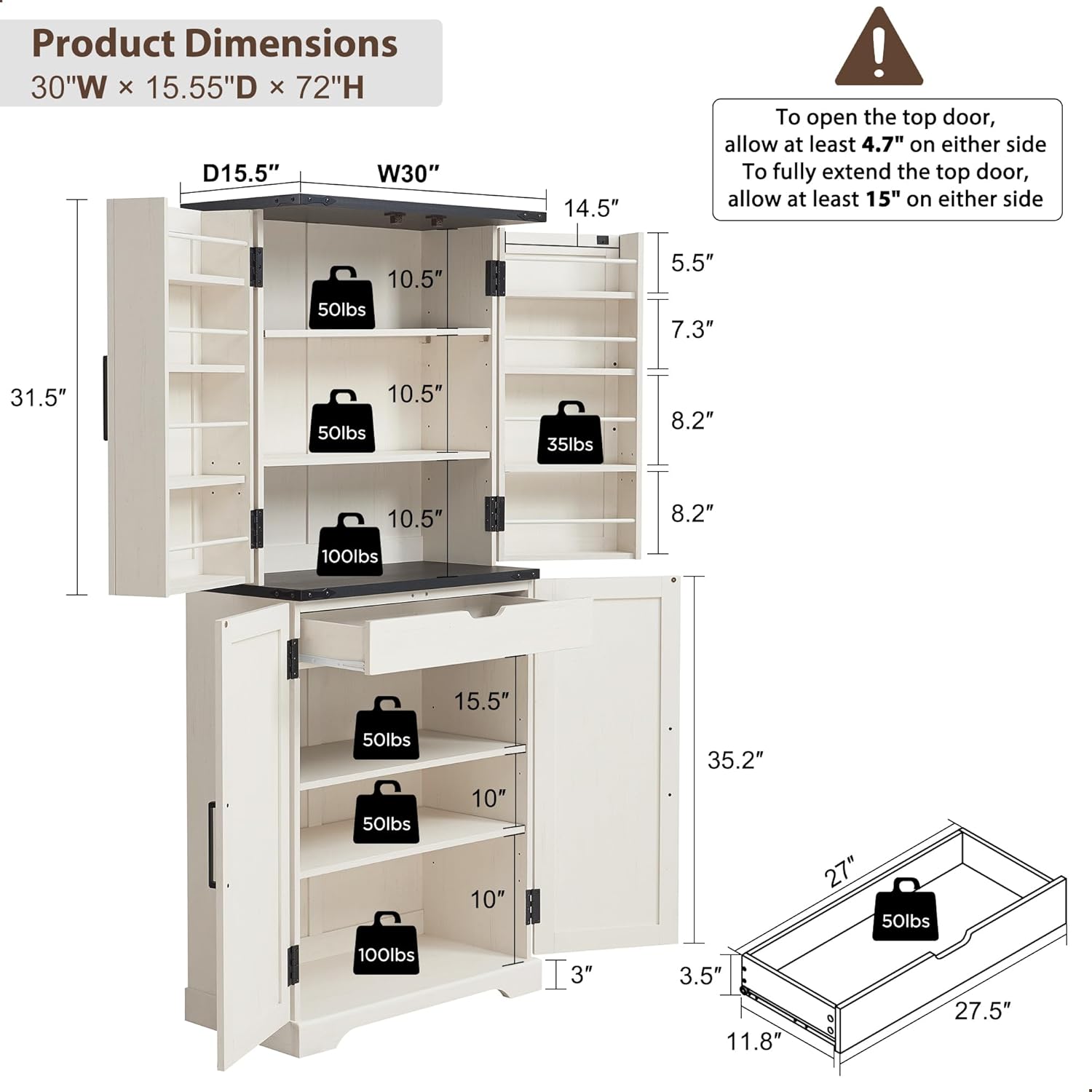 - Discover Versatile Storage Solutions: Unleash the potential of your space with our storage cabinent, generously sized at 30"W × 16"D × 72"H. Tailor your storage needs with 6 shelves (4 adjustable), 8 door shelves (2 adjustable), and a smooth-gliding middle drawer. Beyond organizing your kitchen essentials, this cabinet effortlessly transitions to accommodate bathroom necessities and enhance living room aesthetics. Elevate every corner of your home with impeccable organization.
