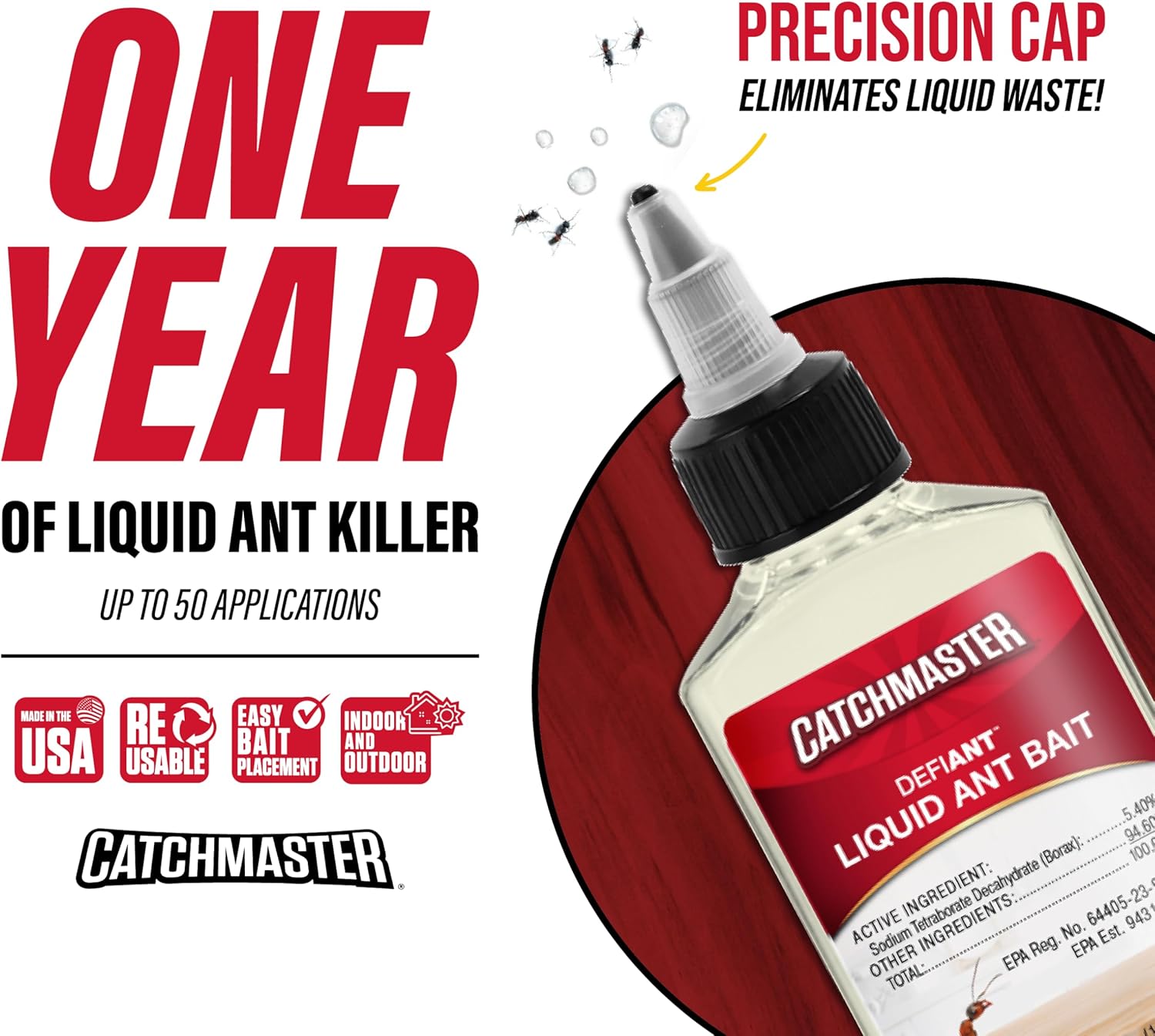 - REUSABLE & REFILLABLE SYSTEM: The DEFIANT liquid ant bait system can be reused and refilled. The 3.38 oz bottle will last up to 1-year in the average home, which could help you save money. The transparent bait stations allow you to monitor ant activity and liquid bait levels daily and refill as needed.