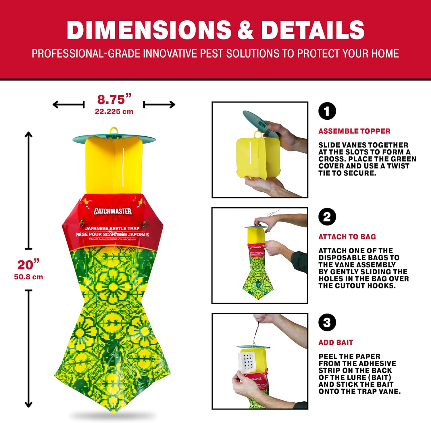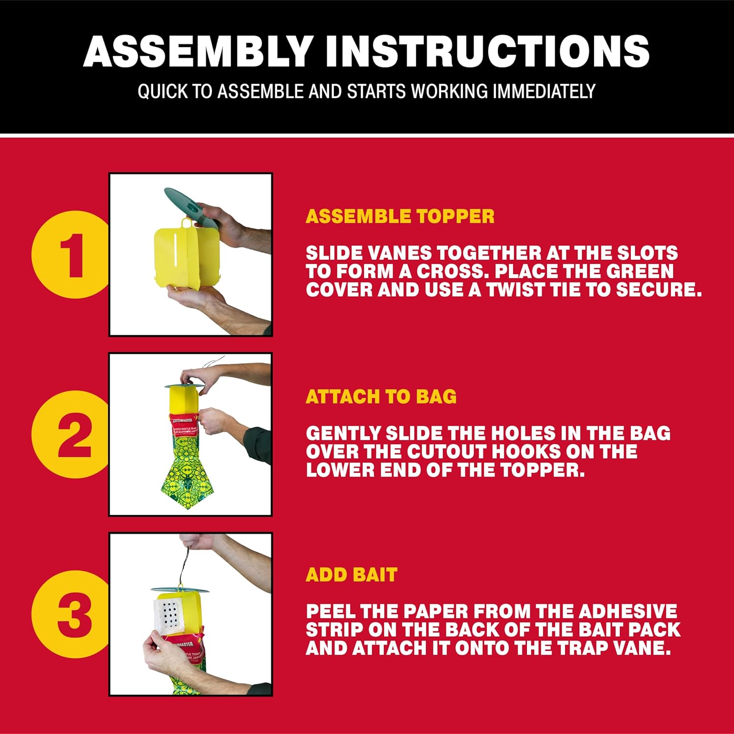 - READY-TO-USE: In a few easy steps you can start catching those pesky beetles and protect your plants. To use the bug catcher, slide the vanes together to form a cross shape. Loop the twist tie through the vane hole and attach a disposable collection bag by sliding the holes in the bag over the cutout hooks. Lastly, stick the bait pack onto the trap vane using the adhesive strip and hang the trap in your desired location. The lid prevents the bag from filling with rainwater.