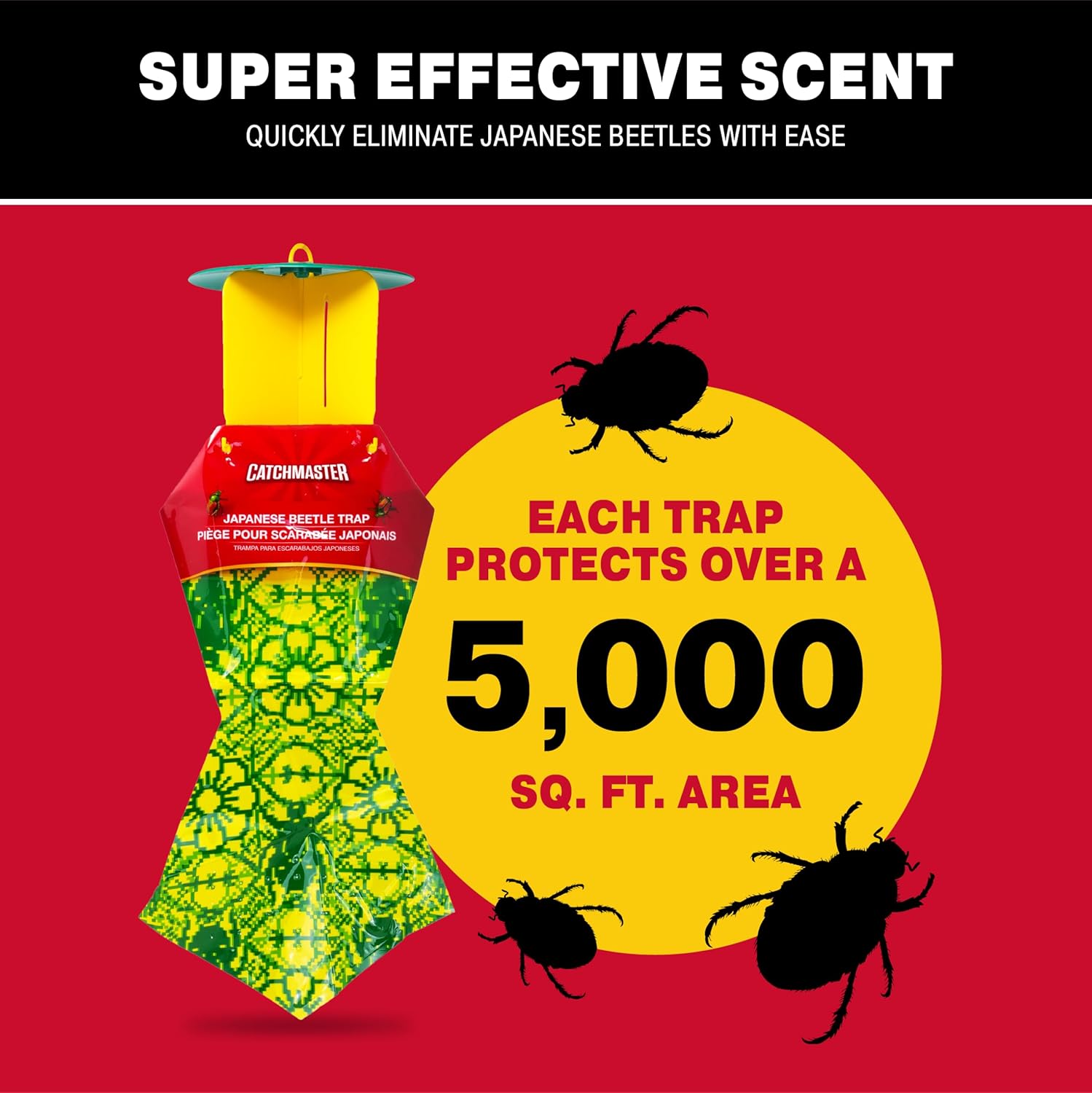 - MAXIMUM COVERAGE: This Japanese Beetle bug trap can cover over 5,000 square feet! Long-lasting, our Japanese Beetle fly bags can last an entire season of pesky beetles. The hourglass-shaped disposable collection bags ensure that the beetles have been securely trapped. Once the bug is in the trap, it's not escaping. More effective than fly tape and requiring less effort than fly swatters, the Japanese Beetle Trap will keep your yard safe from beetles.
