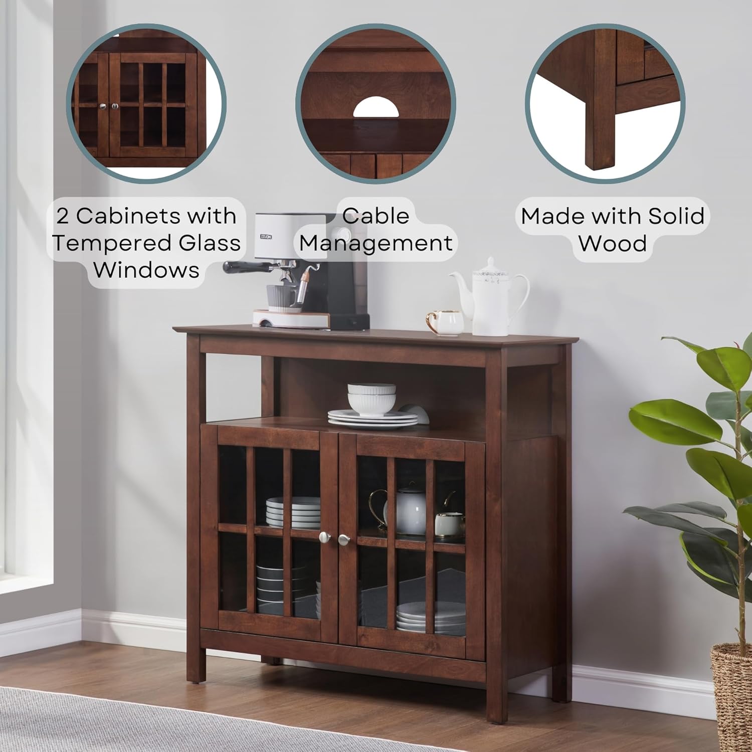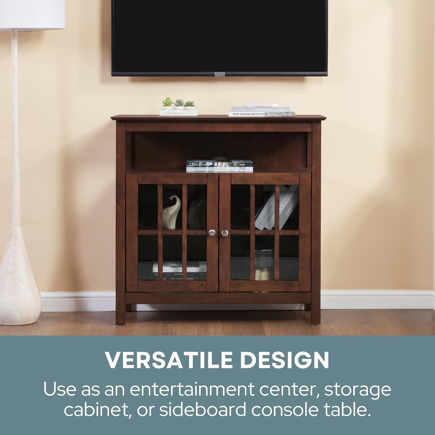 - SPACIOUS STORAGE: With a total of 4 tiers of shelving, this piece offers plenty of space for a cable box, gaming consoles, and much more. Beautiful craftsman cabinets with stylish doorknobs and tempered glass windows offer semi-concealed storage.