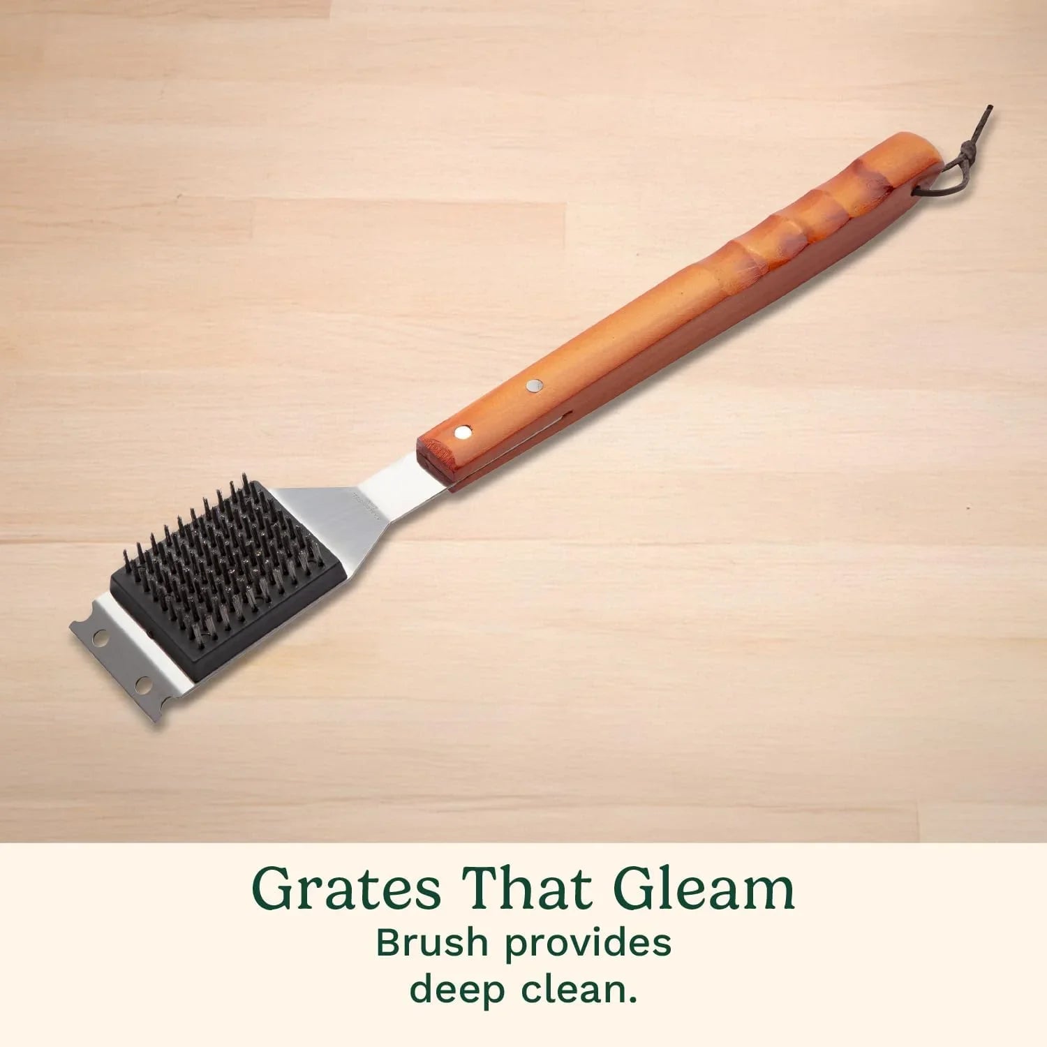 COMPLETE BBQ TOOL SET: Includes an 18.5” spatula, 17.5” grill fork, 17.5” cleaning brush, 18” tongs, four stainless skewers, and four corn cob holders.