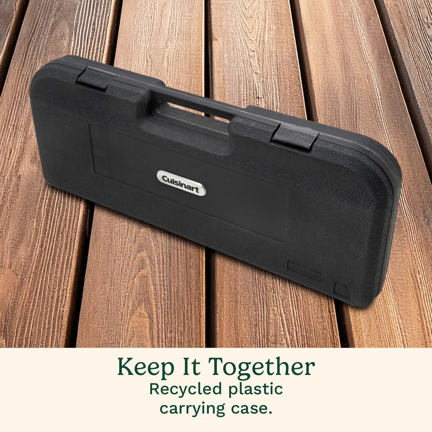STORAGE CASE: The grill set is stored in a compact recycled plastic carrying case, perfect for keeping your grill accessories organized.