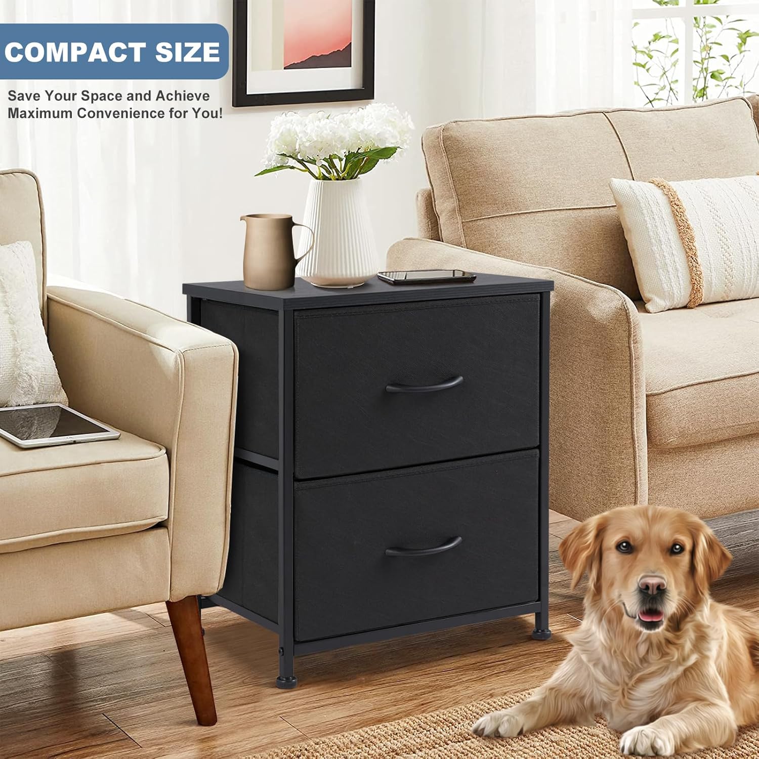 - Compact Size & Durable This nightstand is ideal for small rooms such as apartments, college dorms, or entryways. It maximizes storage capabilities without taking up excessive space. This allows it to serve as a mini dresser, accommodating clothes or accessories in an organized manner, making it an excellent choice for those with limited storage options. The nightstand is also designed with durability in mind. It is made from high-quality metal and fabric.