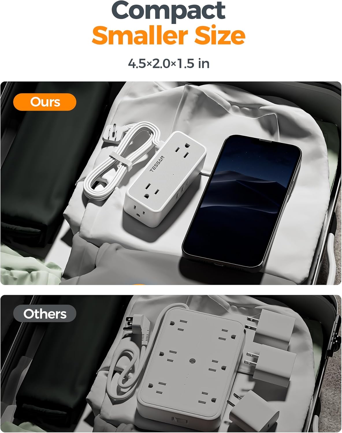 Stay powered and protected with the TESSAN Flat Plug Power Strip Extension Cord – the compact, smart charging solution for your home, office, or dorm. With 4 AC outlets, 1 USB-C port, and 2 USB-A ports, this power strip is perfect for powering all your essential devices in one place.