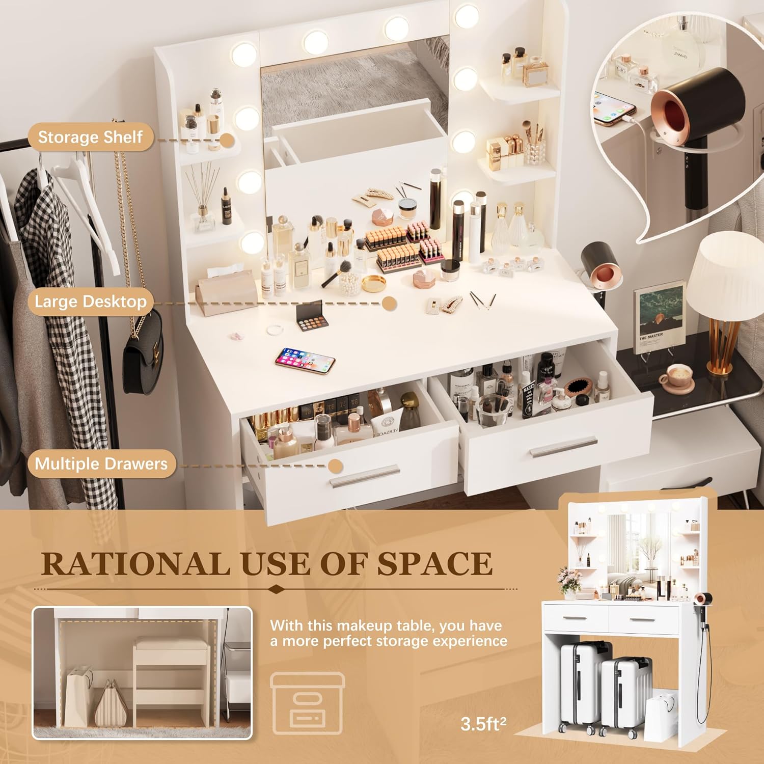 Furmax Make up Vanity Desk with Mirror and Power Outlet, Vanity with 3 Color Light Options Adjustable Brightness,Vanity Desk with 2 Drawers, 6 Storage Shelves (White, with Bench)