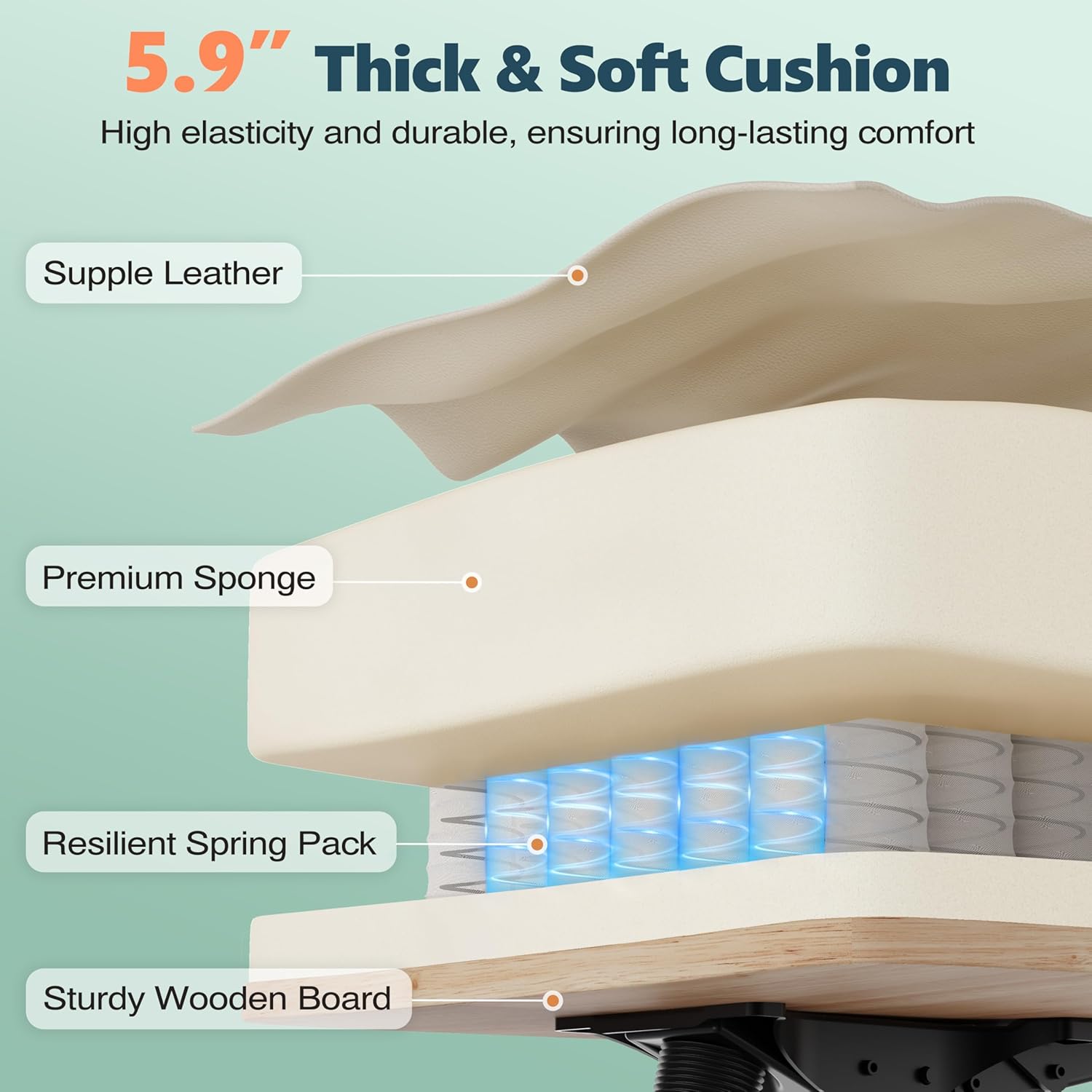 - Wide & Thick Cushion - Crafted from skin-friendly and wear-resistant leather, GABRYLLY ergonomic office chair is designed with high-elasticity springs and filled with thick cotton to ensure both comfort and support. With a 5.9'' seat depth and 21.6'' width, the cushion is incredibly plush and generously sized. This combination provides a perfect balance of softness and firmness, reducing pressure on your hips and lower back, providing ultimate comfort for long hours. Soft PU leather seat is water-resistant and stain-proof, making it comfortable and easy to clean.