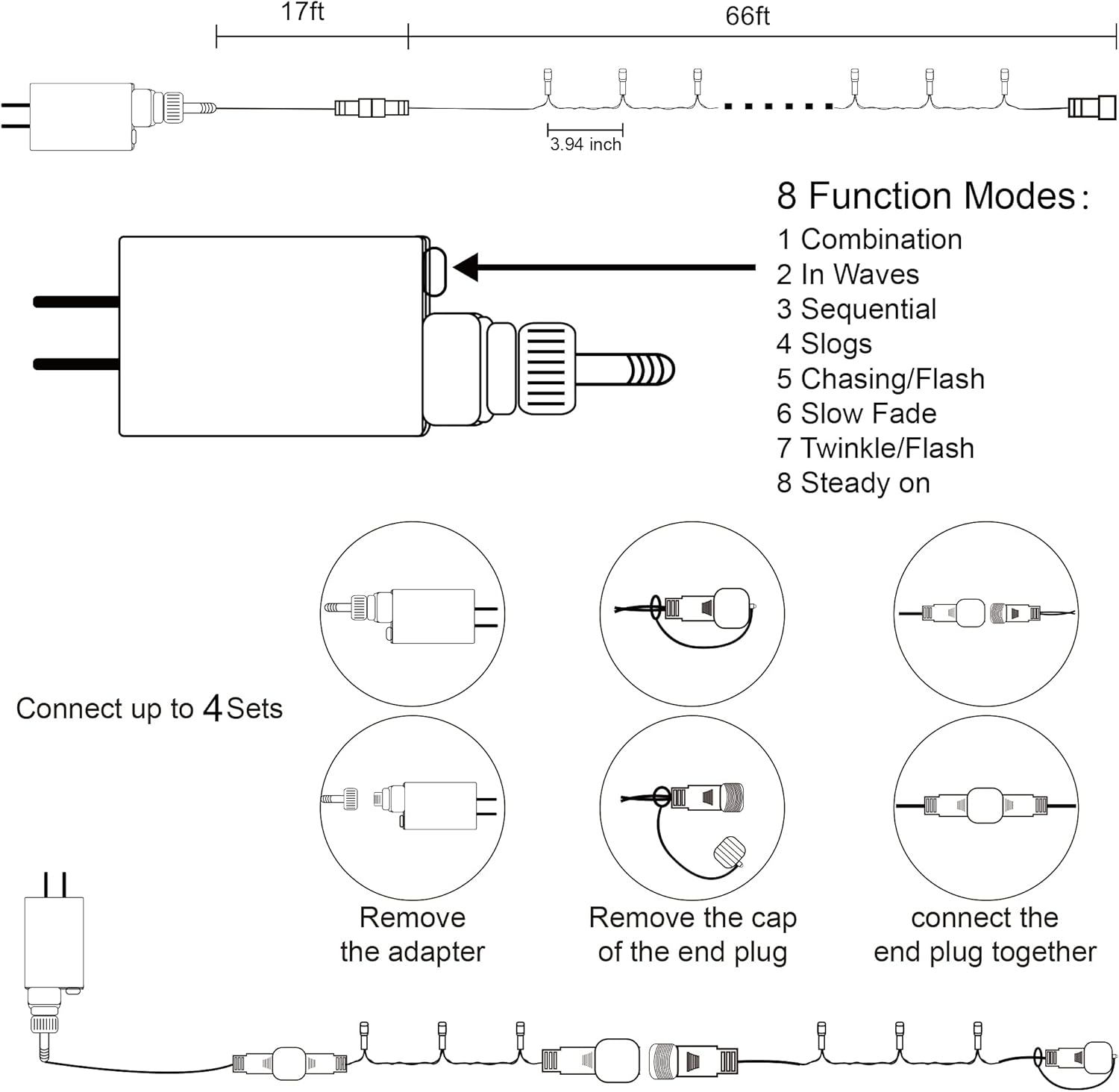 - 66ft Christmas string lights with 200 white individual LED bulbs. Each Christmas lights has end-to-end connection; you can connect up to 4 sets together to illuminate a wider range.