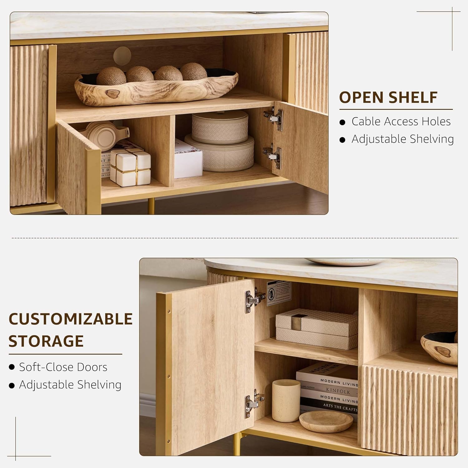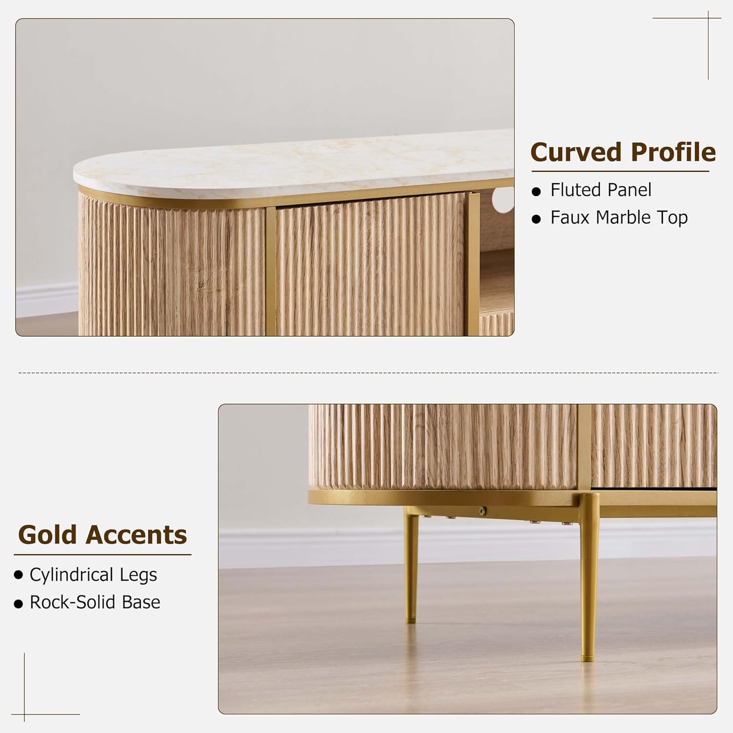 - 70 "LARGE LUXURY TV STAND: The distinctive wave-like fluted panel and Curved Profile Design make it can be effortless paired with other modern furniture styles. The White/Dark Blue/Natural Oak faux marble top replicates natural marble patterns, maintaining a sense of luxury while reducing weight. Golden metal accents add a touch of visual opulence, and the warm golden tones bring a cozy atmosphere to the room, making it your ideal modern luxury piece for the living room.