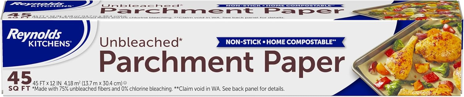 - Package Includes—One (1) Reynolds Kitchens Unbleached Parchment Paper Roll measuring 45 feet long by 12 inches wide (45 square feet total)